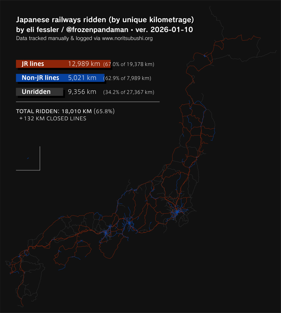 As an archivist at heart (and in practice), I often find myself naturally documenting things, and near the end of 2024, I figured it’d be cool to start tracking all the railways I’d ridden in Japan. Luckily I’d already been saving my IC card history – and between this, record-keeping of my IC card and eki-stamp collections, a lot of cross-referencing stuff with my phone’s camera roll, and some difficult memory-digging, I was able to accurately document pretty much all of the train rides (with dates!) I’d taken in the country. Shortly after, I realized I was pretty close to 10,000 unique km of rail ridden across Japan, so I made it a goal to hit that mark, which I successfully did the following month. At this point, I’m not vying for any specific number, rather just to have as many experiences on as many new railways and lines as possible, and I’ll often go out of my way to ride them along certain routes for the sake of adventure.