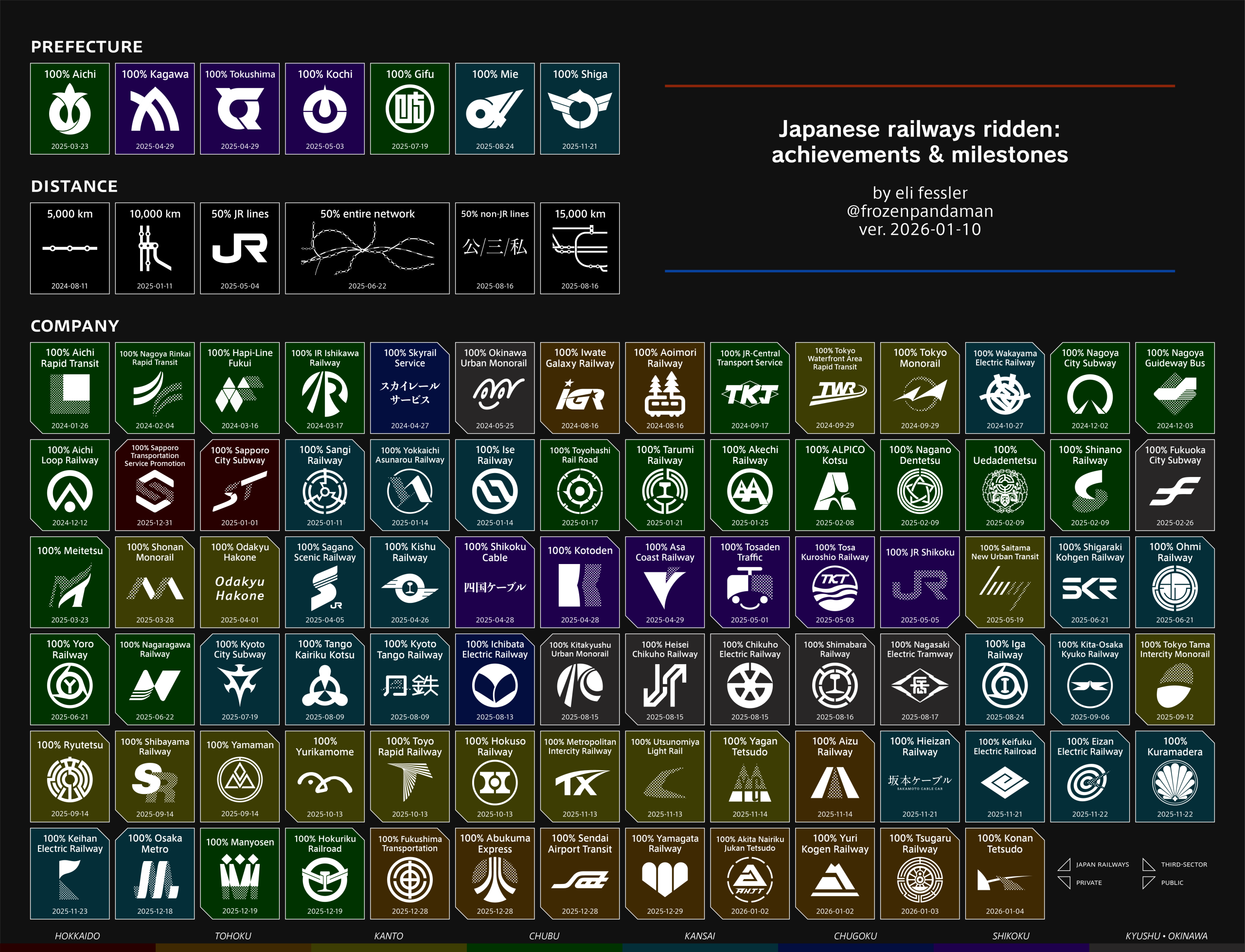 This page shows my “noritsubushi” map, logs for which I record on a Japanese site of the same name and then export to Illustrator to visualize, along with a display of my various “achievements”. The word 乗り nori is the stem for the verb “to ride”, and つぶし tsubushi is a way of saying “doing something completely”, although that second word can also have a meaning of “time-killing” – and while it’s not exactly the intended reading, it’s one I like more in this context. To me, these diagrams are visual representations of my habit of riding public transit around to while away time: as a way to discover new surroundings and communities, and to get the experience of seeing a new route and new scenery on a new vehicle and in a new place.1And for those people that are able to – presumably after many years, and after spending way too much money – ride every route across a whole system, achieving 100% completion of having passed over all railway tracks in a certain place, that’s called 完乗 kanjo. Literally: a complete ride. At its heart, it’s about exploring – one of my favorite things to do in the world!
